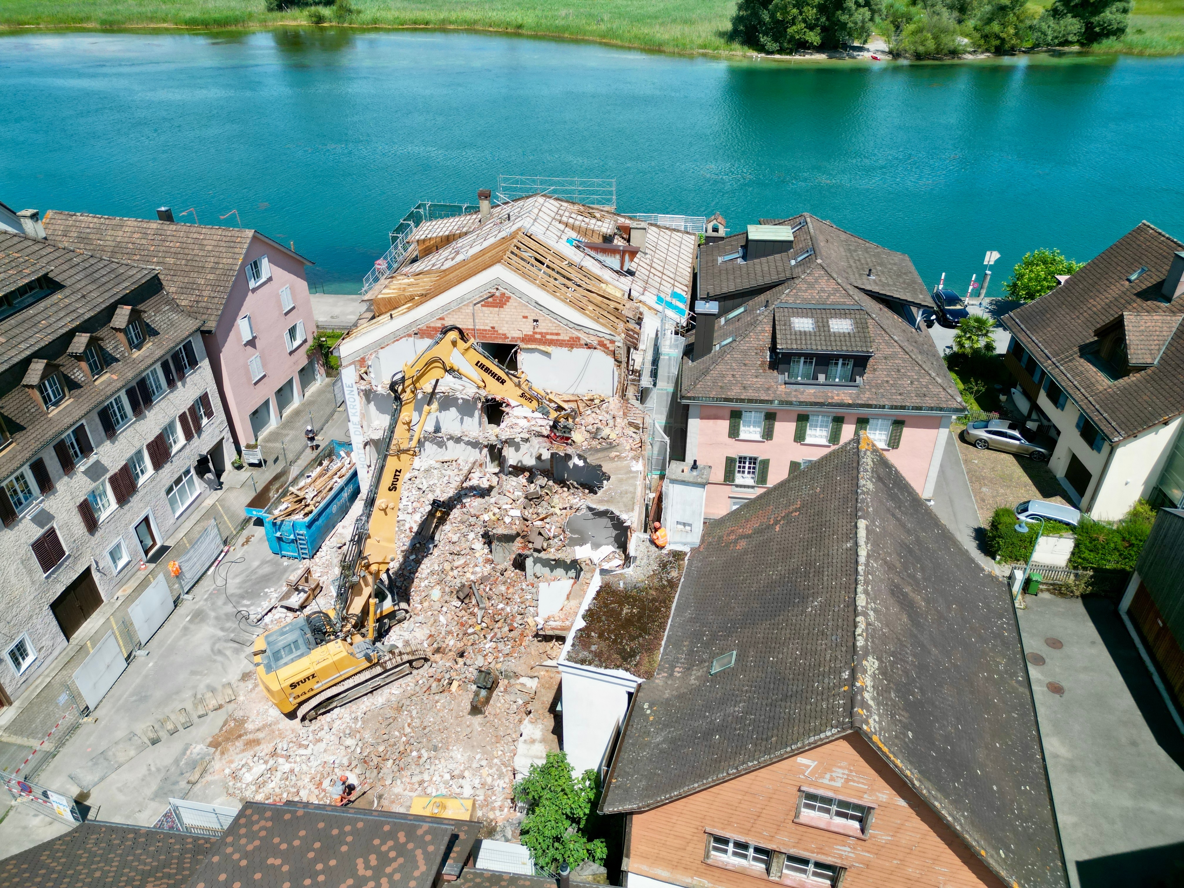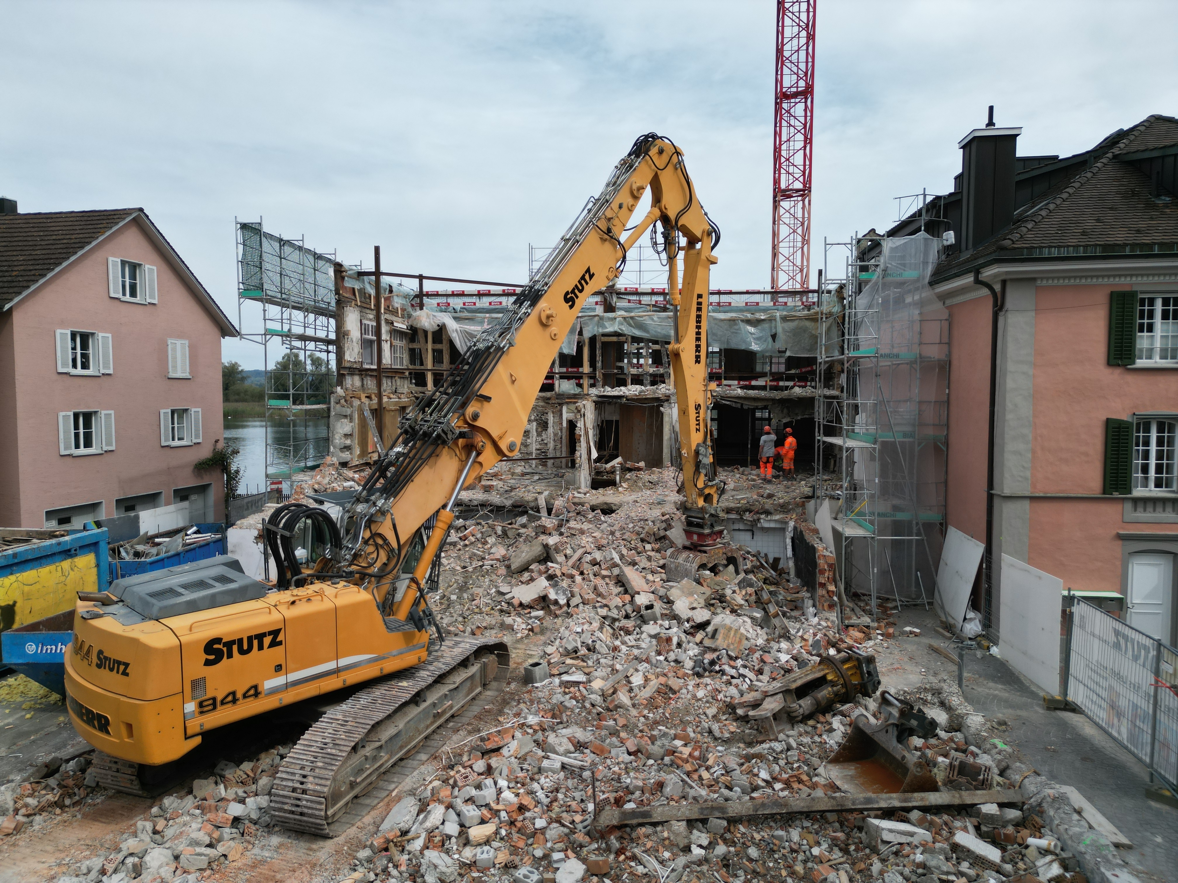 Wenig Platz für die Installation. Abbruch von zwei Häusern, eines komplett und eines teilweise. Stützgerüst für die Fassade vom Gebäude seeseitig. Bohren von Mikropfählen und Pfählen. Aushub für Fundamente und Bodenplatte erstellen. Werkleitungsanschlüsse und Wasserleitung erstellen. Aushub und verlegen der Kanalisation unter der Bodenplatte.