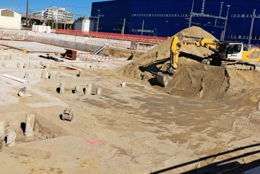 Bei diesem Projekt wurde erst die Schadstoffsanierung durchgeführt, anschliessend folgte der Abbruch, der Baugrubenaushub mit vielen Vertiefungen und Absätzen, Kanalisationen, Schächten und Versickerungsgruben sowie die Umgebungsarbeiten mit 3-schichtigen S Belägen und Verbundsteinplätzen. Hervorzuheben ist folgenden: Einerseits musste die bestehende Gleisanlage der SBB unter der Axpo-Leitung zurückgebaut werden.Andrerseits wurde eine 2.5 Meter tiefe und 25 Meter lange Versicherungsgrube, welche nahe bei einem Axpo-Mastfundament zu liegen kam, erstellt. Zudem mussten mithilfe des Umweltplaners die bestehenden Öltanks geortet und rückgebaut werden
