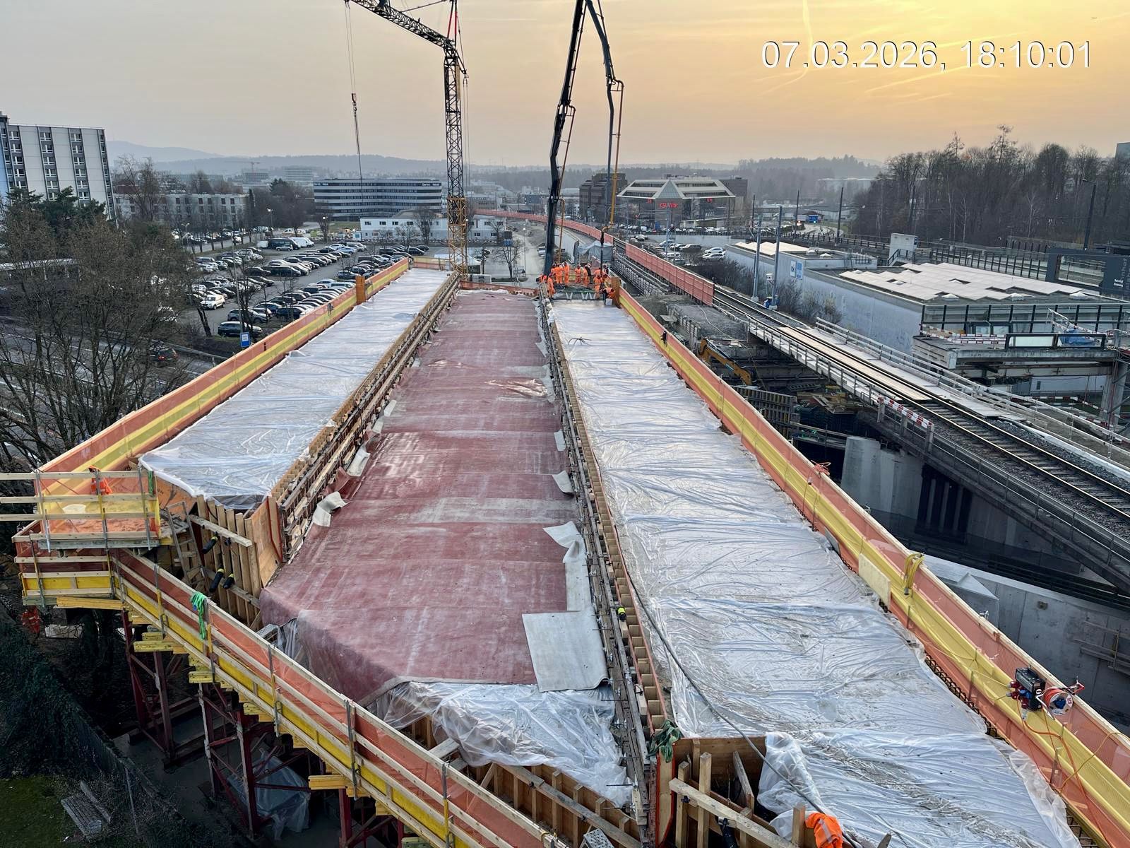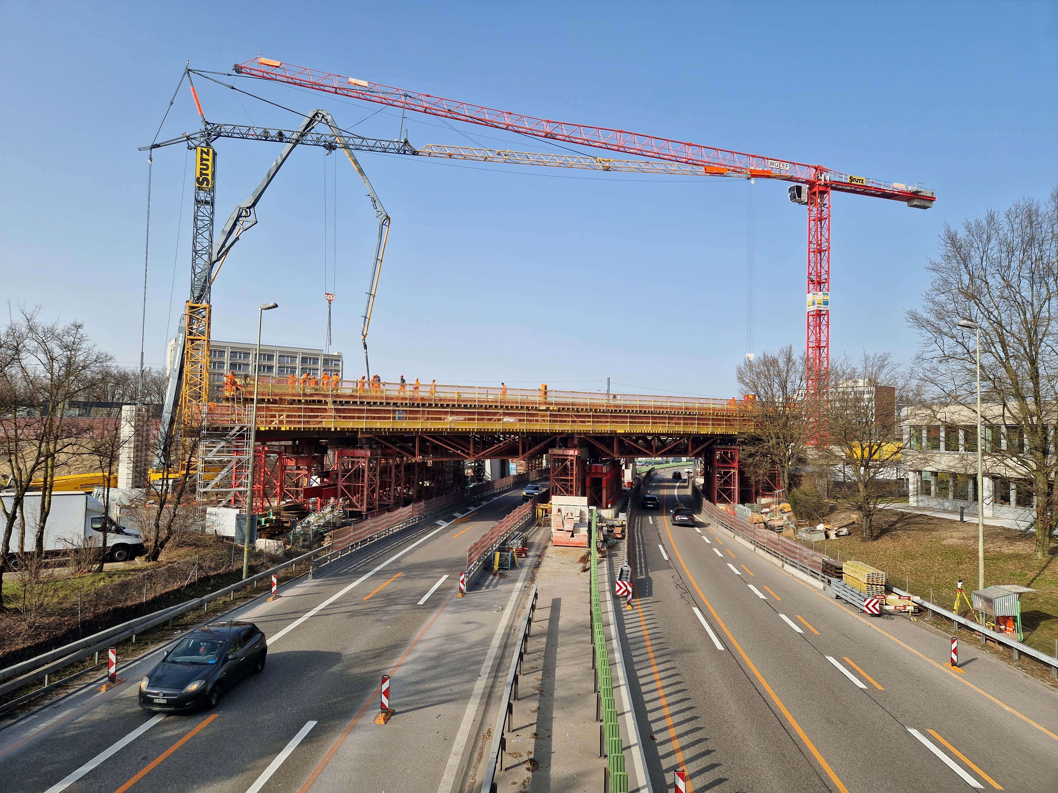 Im Vordergrund die frischbetonierte Brücke, rechts daneben die bisherige Zuglinie über der Autobahn.