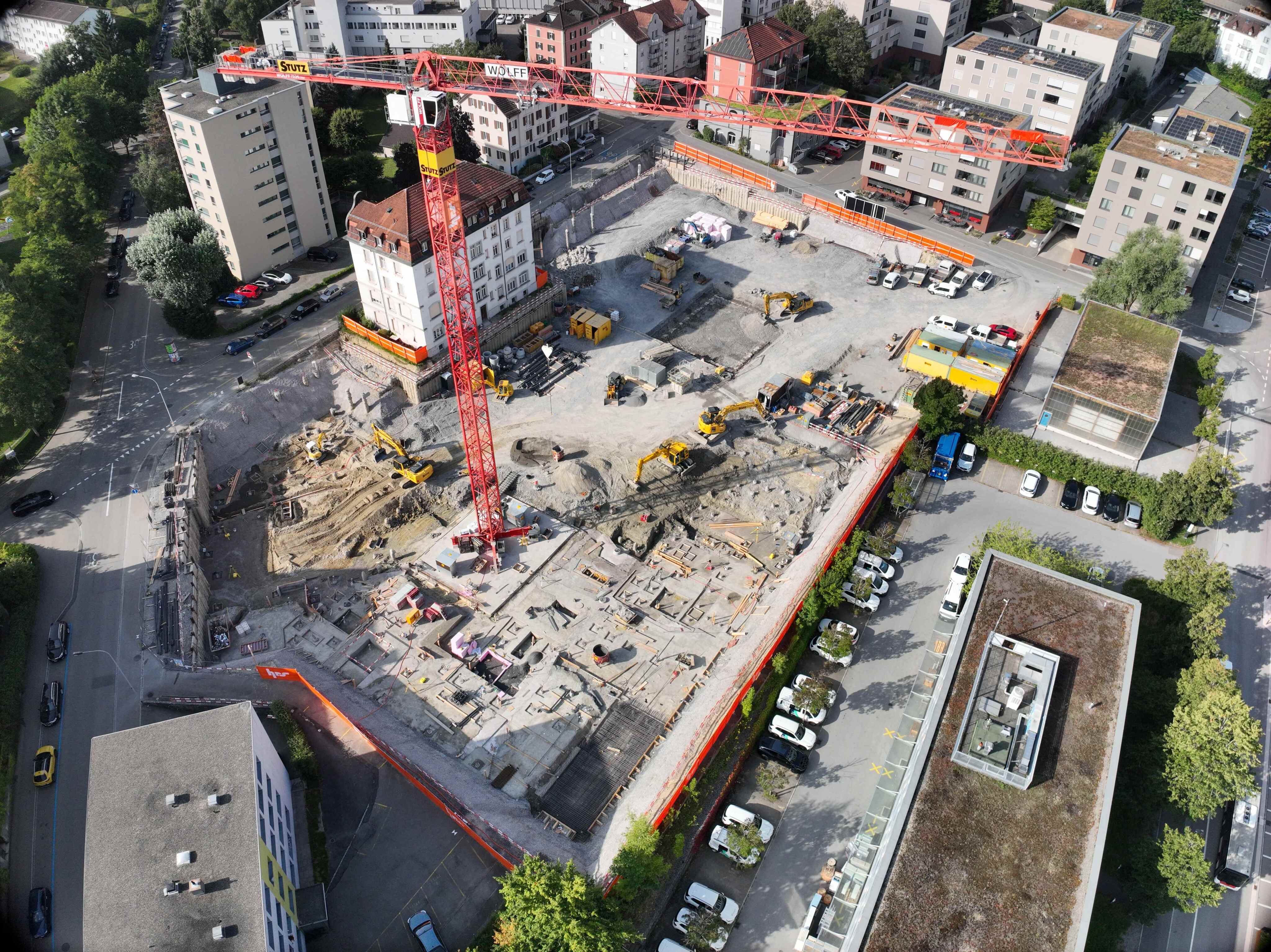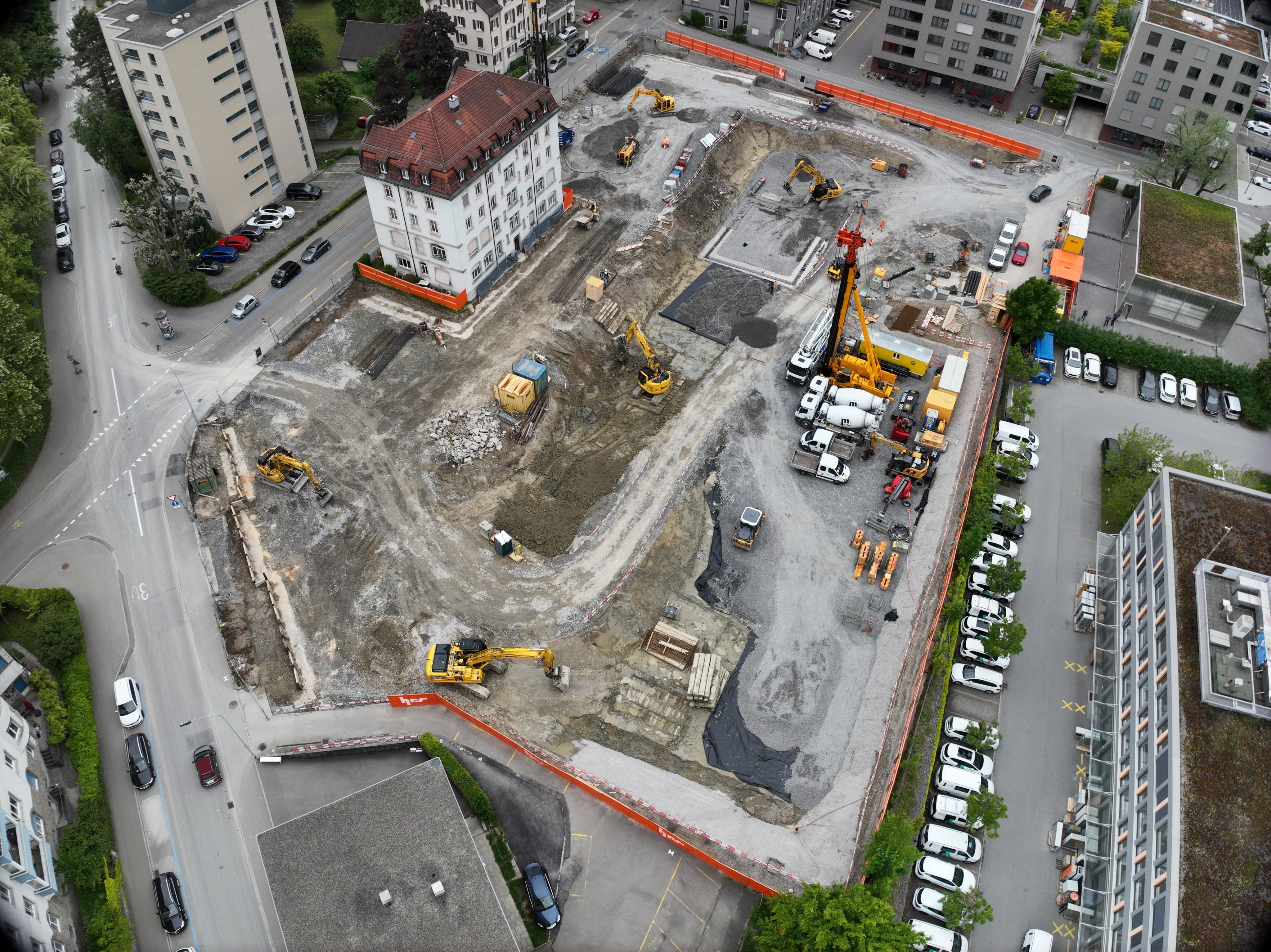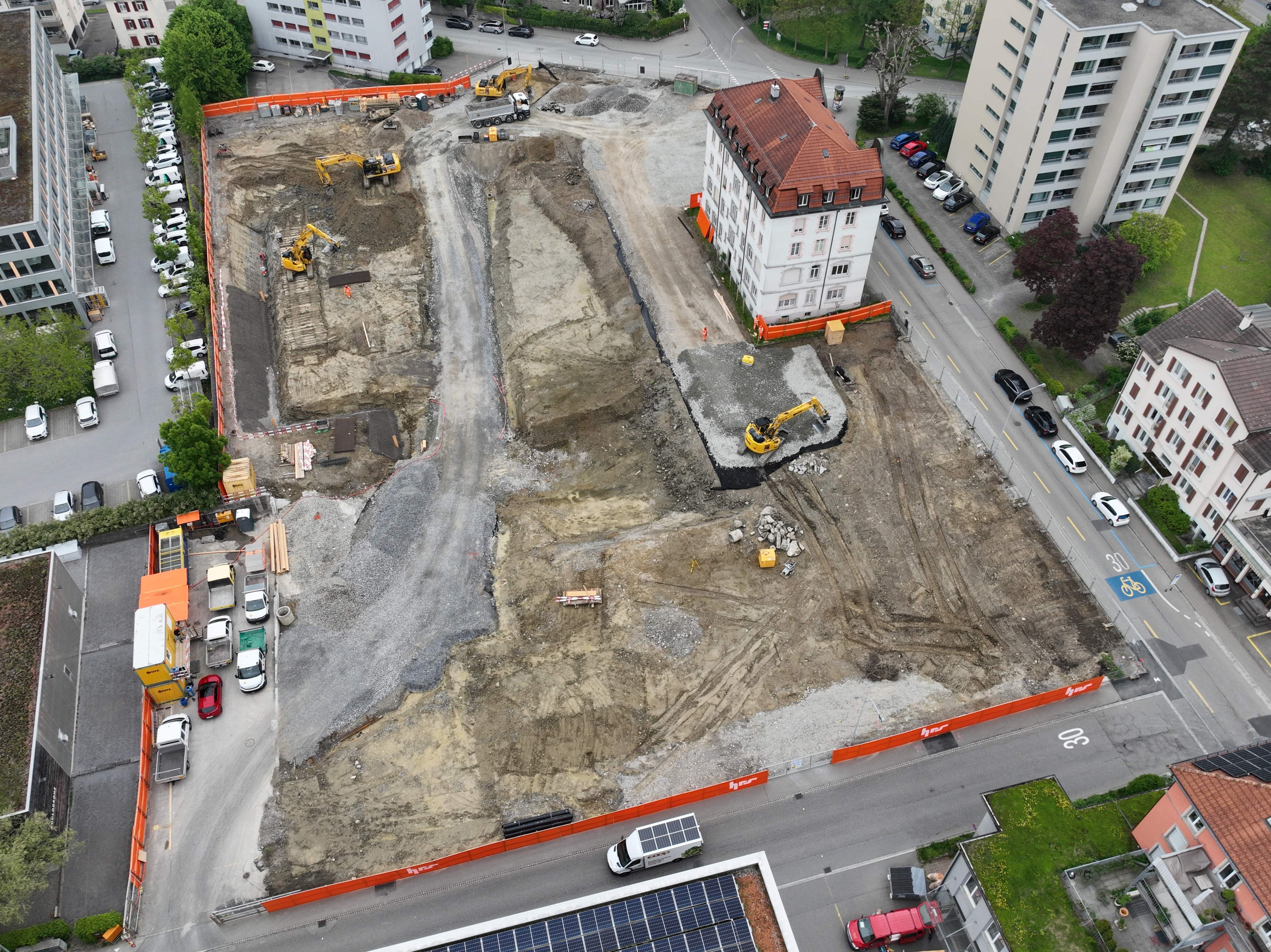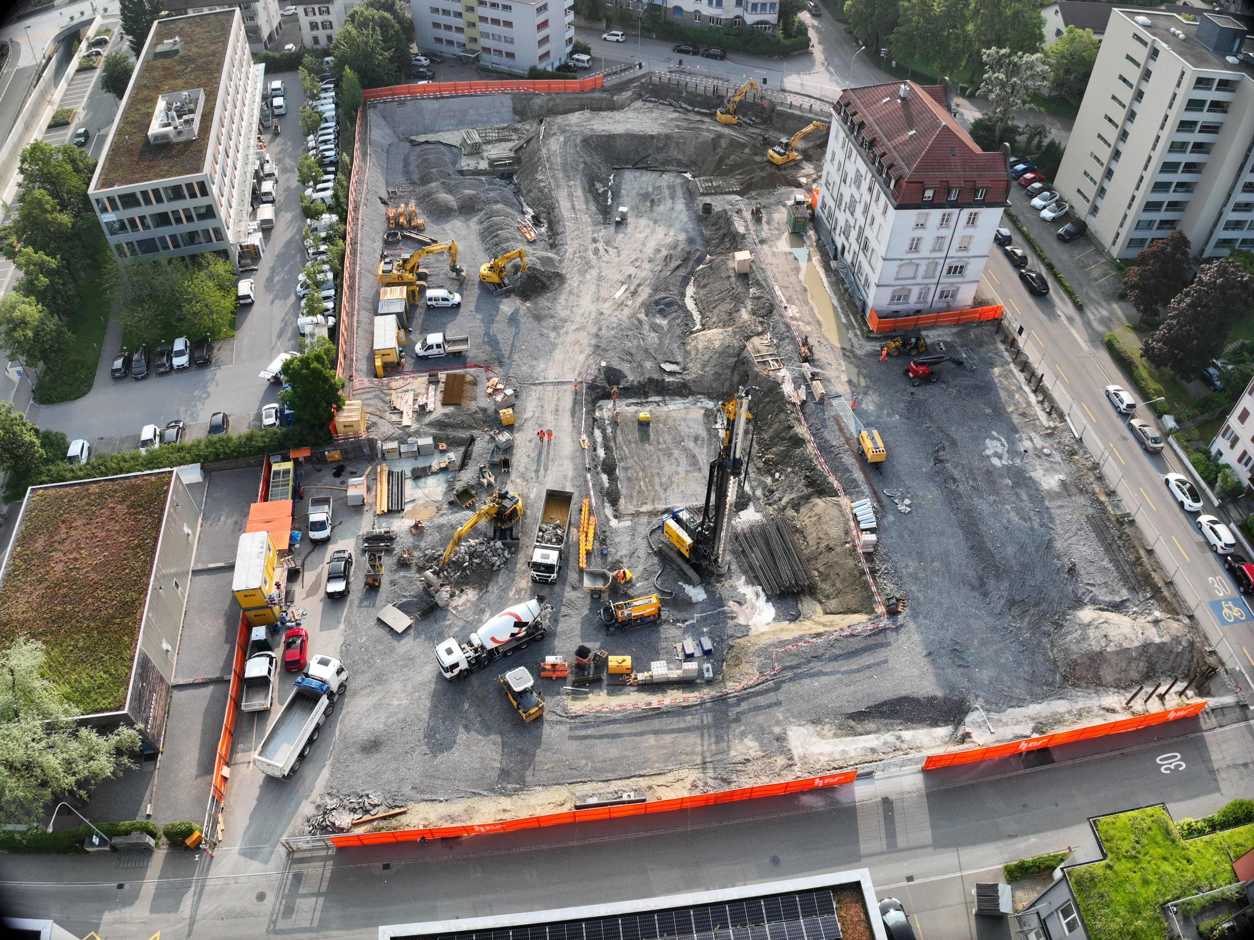 Im Frühjahr 2025 wurden die Aushubarbeiten durch unsere Tiefbau-Abteilung ausgeführt. Dazu gehört auch der Baugrubenabschluss durch die Spezialtiefbauer. Im August beginnt der Startschuss für die Hochbauer.