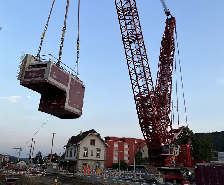 Bhf. Pfungen: Planung, Dimensionierung und stat. Nachweis durch ARGE, Integrale Vorfabrikation von 4 Rampenelementen, 1 Treppenelement und 1 Personenunterführungselement von je ca. 11m Länge vor Ort auf der Baustelle, Planung und Umsetzung Einhub mit Eigengewichten von bis 200 to. mittels 1`000 to. Raupenkran und hydr. Hubsystem mit integrierter Zugkraftüberwachung.