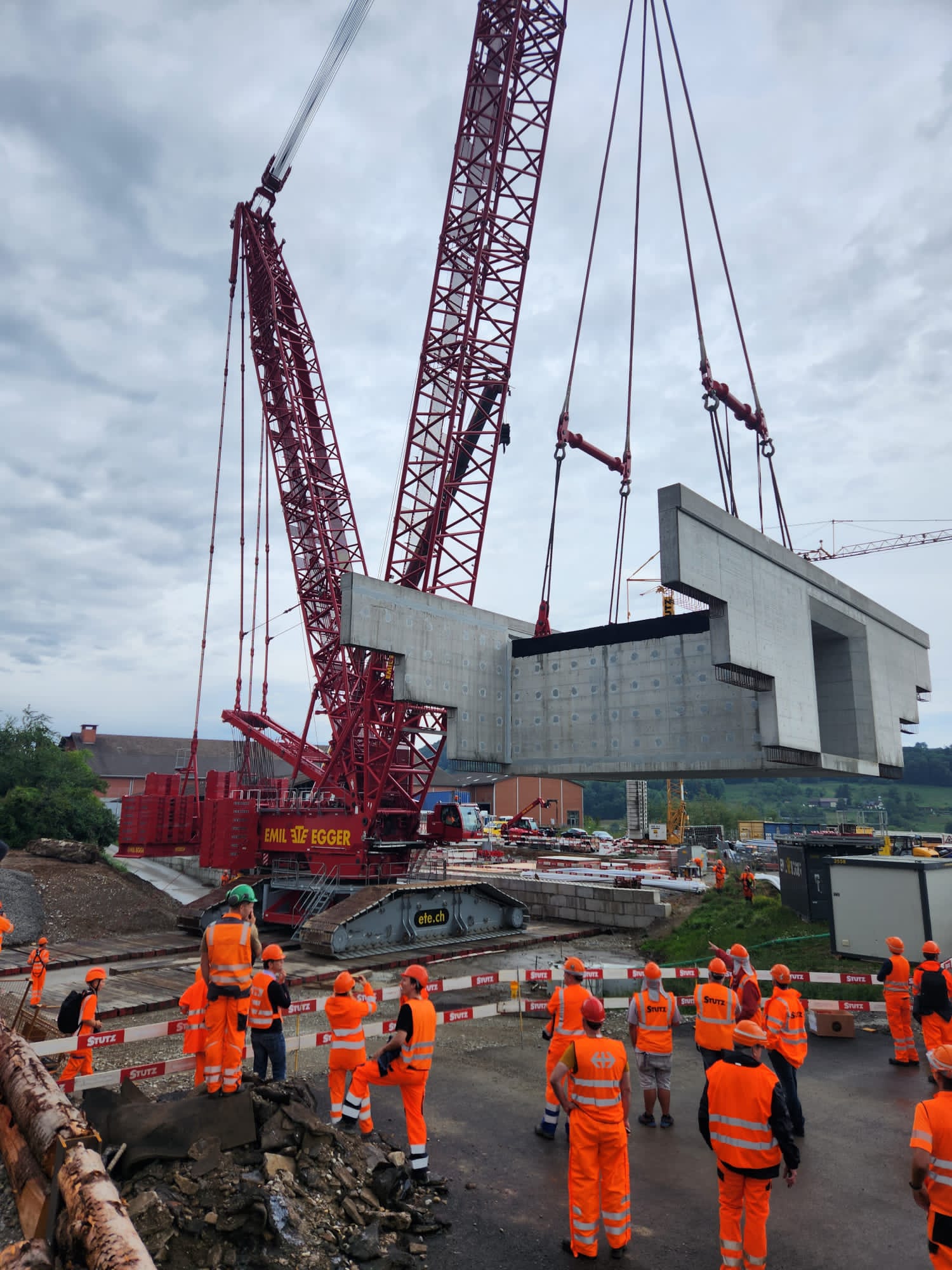 Wegunterführung Riedäcker: Planung, Dimensionierung und stat. Nachweis durch ARGE, Integrale Vorfabrikation vor Ort auf der Baustelle, Planung und Umsetzung Einhub mit Eigengewicht von rund 500 to. mittels 1`000 to. Raupenkran Personenunterführung