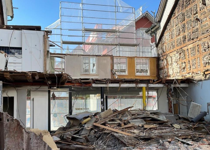 Das Spezielle bei diesem Abbruch war, dass es sich um ein Reihenhaus in der Mitte handelte. Niemand wusste genau, wie die Ge- bäude gebaut worden waren. Die Zufahrt wurde über den Toggenburgerplatz sichergestellt. Um an das Hauptobjekt, heran zu kom- men, musste zuerst ein angrenzender Hausteil zur Hälfte rückgebaut werden. Sämtliche angrenzende Häuser waren über die Bau- zeit bewohnt. Dies erforderte eine sehr hohe Präzision beim Rückbau. Die Obergeschosse konnten mit diversen Trennschnitten gut voneinander getrennt werden. Im Keller waren die Häuser teilweise auf dieselben Fundamente abgestützt. Dies musste täglich neu beurteilt und vorsichtig gesichert werden. Schlussendlich wurden die Kellerwände zu den Häusern links und rechts wieder mit Aus- hub gesichert. Die Wand gegen das Trottoir musste ebenfalls stehen gelassen werden, damit das Trottoir nicht abrutschen konnte. Die Bauzeit betrug insgesamt nur 18 Tage.
