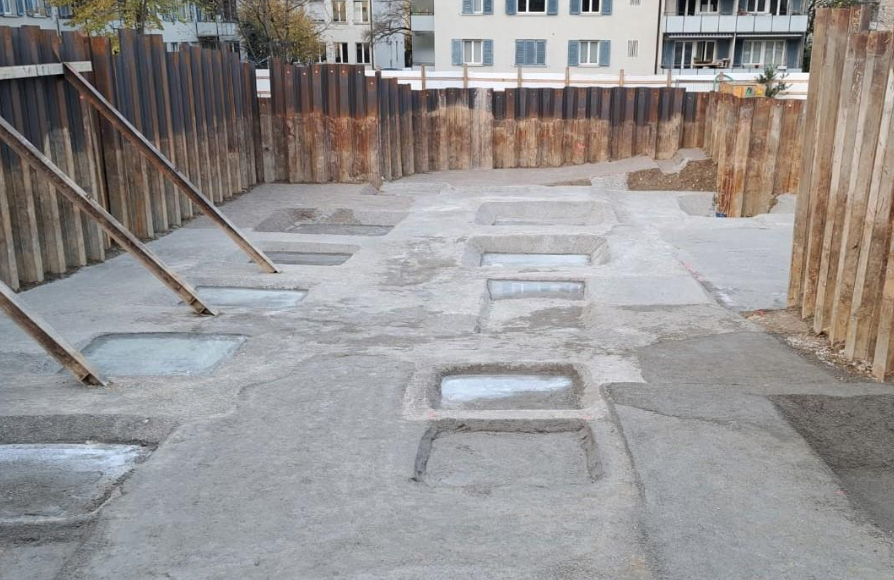 Innerstädtische Baustelle, Rückbau, Baugrubenabschluss mit Spundwandprofil, Aushubarbeiten, Baugrubenspriessung, Wasserhaltung, Hinterfüllung