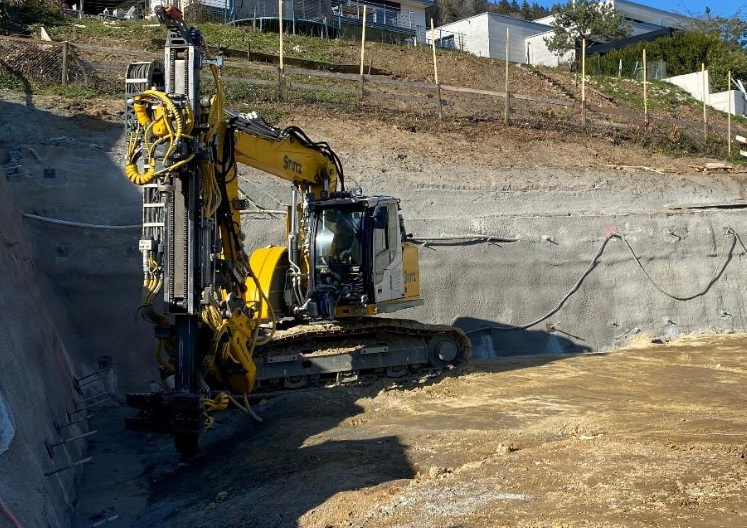 In Abtwil durfte der Geschäftsbereich Rück- und Tiefbau der Firma STUTZ AG Bauunternehmung einen Ersatzneubau für ein Einfamilienhaus realisieren. Die Parzelle musste zuerst gerodet werden, anschliessend konnte der Rückbau des bestehenden Hauses erfolgen. Im Anschluss wurde die hangseitige Böschung mittels Spritzbeton und Nägeln gesichert. Aufgrund des Felsverlaufes musste das Gebäude auf Baumeisterriegel wie auch auf Drehpresspfähle fundiert werden. Am Schluss wurde noch eine Sauberkeitsschicht mit diversen Negativschalungen und Absätzen erstellt.