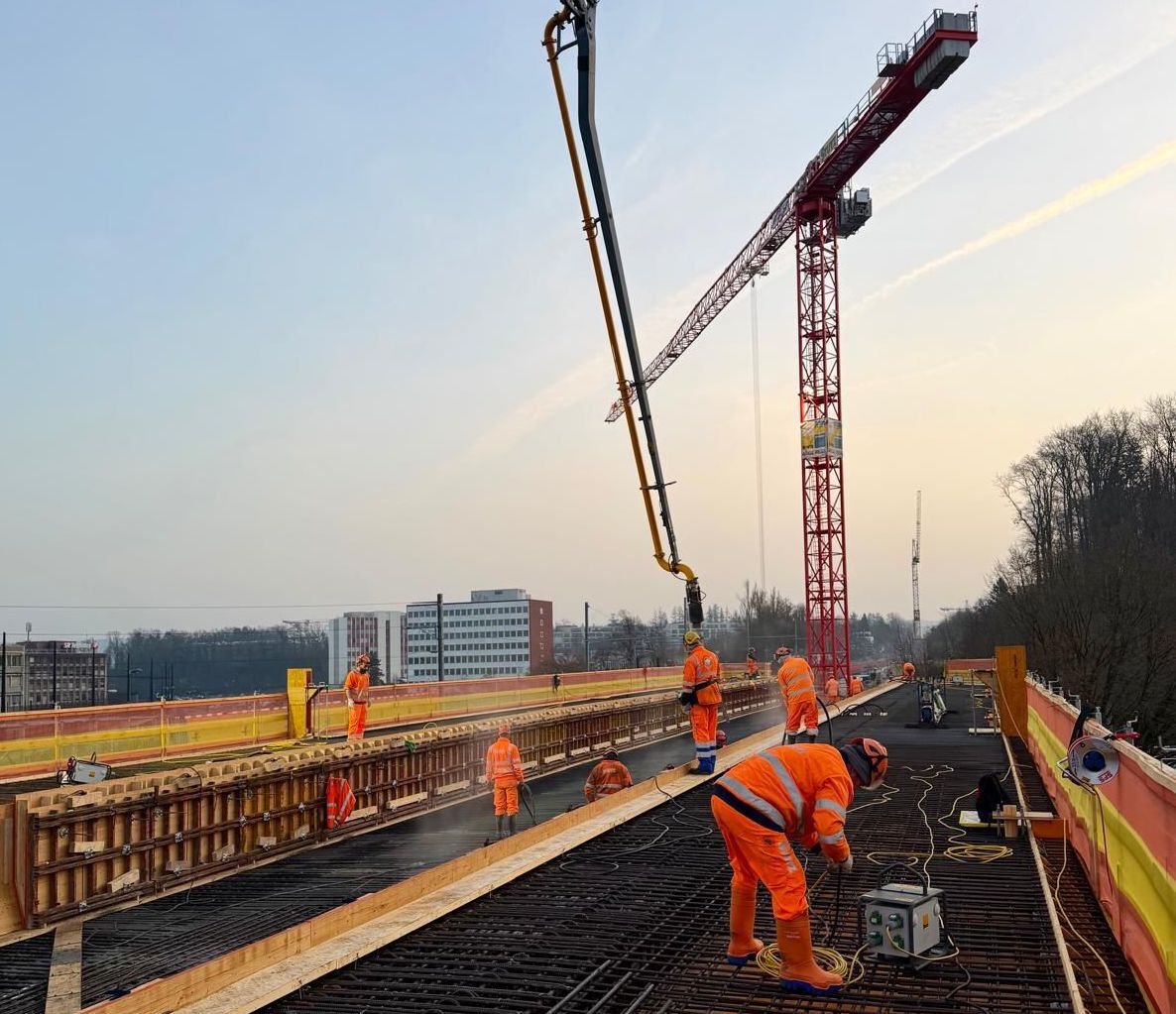 Es wurde von zwei Seiten her betoniert: von einer per Kran, von der anderen mit einer Betonpumpe. Innert 12 Stunden wurden so knapp 1000 Kubikmeter Beton eingebaut. Unsere routinierte Brückenbauer-Equipe konnte am Ende eines langen Tages auf einen erfolgreichen Sondereinsatz zurückblicken.